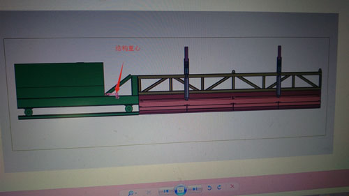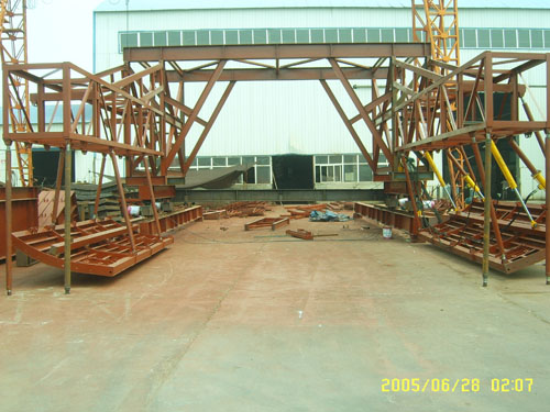 結(jié)構(gòu)∶液壓驅(qū)動自行式移動棧橋,主要由前橋、主橋、后橋、前段支架、后段支架、行走驅(qū)動裝置、行走支架七個部分組成。