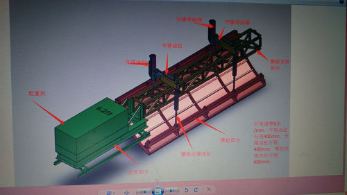 結(jié)構(gòu)∶液壓驅(qū)動自行式移動棧橋,主要由前橋、主橋、后橋、前段支架、后段支架、行走驅(qū)動裝置、行走支架七個部分組成。