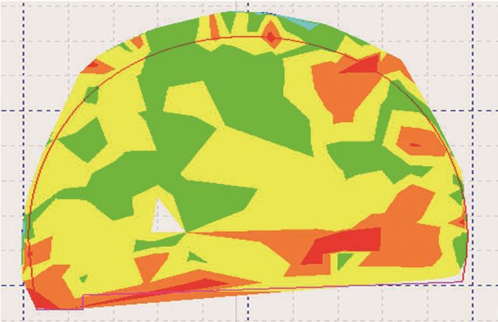 其中,超前鉆孔及加深炮孔法主要利用電腦三臂鑿巖臺車進行超前地質預報,進行鉆孔作業(yè)時,實時監(jiān)測推進速度、沖擊壓力、推進壓力、回轉壓力、水壓力和水流量等參數(shù),并通過MWD軟件分析復原地質情況(MWD地質云圖如圖7所示),形成地質報告,由此可建立隧道大數(shù)據(jù)地質庫。