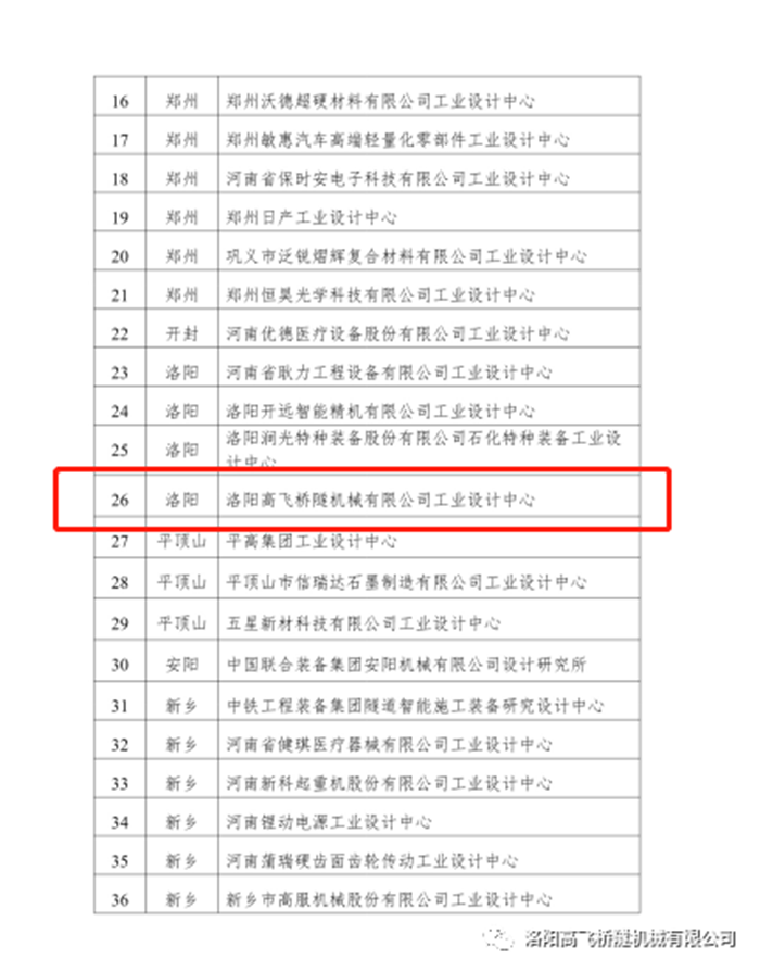 由河南省工業(yè)和信息化廳組織認定的【第五批省級工業(yè)設(shè)計中心】名單公示,洛陽高飛橋隧機械有限公司工業(yè)設(shè)計中心榮列其中。原文如下:
